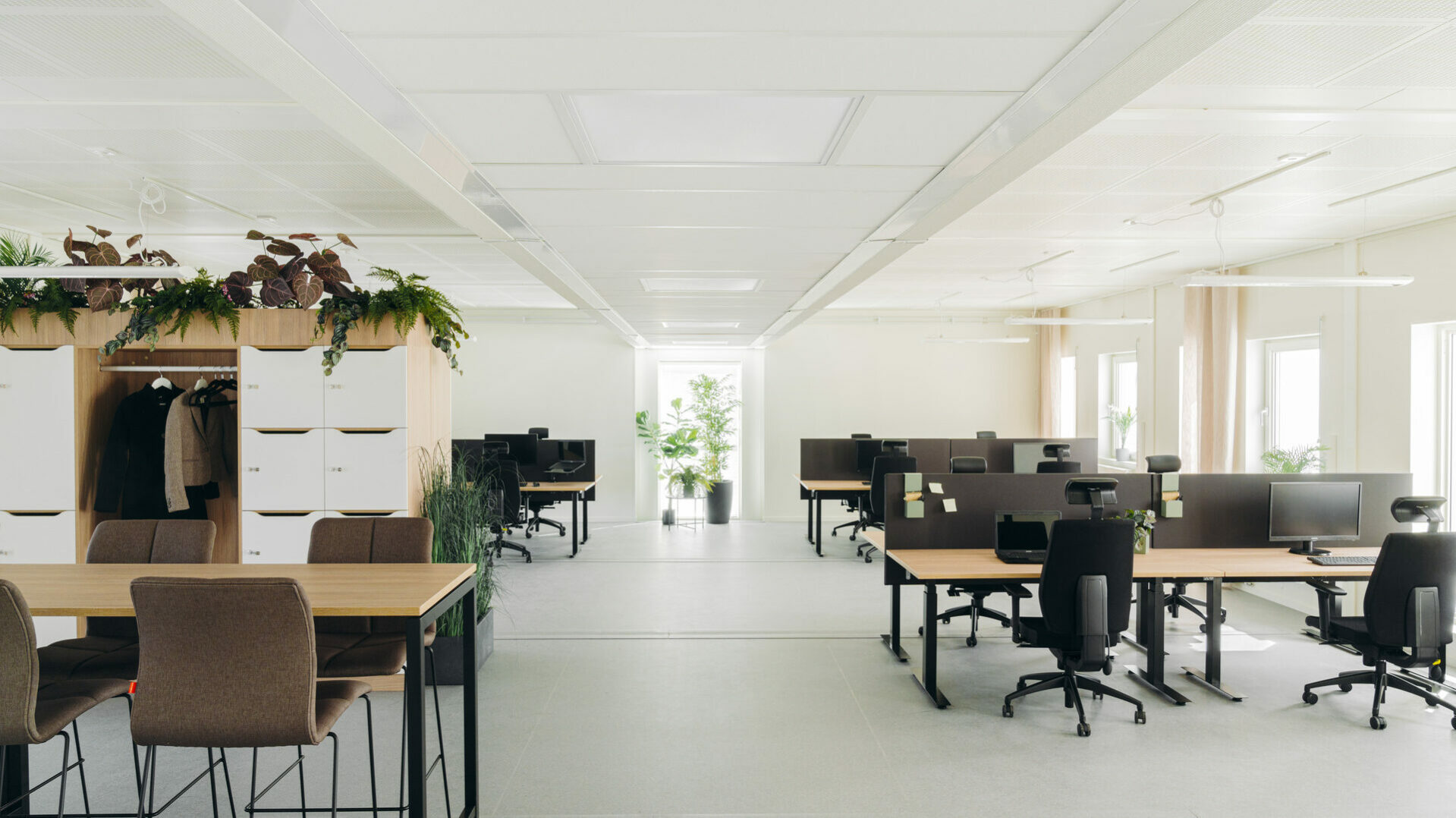 Toimistot ovat valoisia ja ilmavia, ja korkeilla käytävillä on suuria lasiosuuksia. Sisäkaton korkeus on 2,7 metriä, ja uusi ikkunayhdistelmä – pitkä kapea ikkuna leveämmän ikkunan vieressä – tarjoaa avaran näkymän ja paljon luonnonvaloa. Huoneissa on myös ääntä vaimentavat akustiikkalevyt viihtyisän ja rauhallisen työympäristön luomiseksi. Kylpyhuoneiden lattiat on päällystetty matoilla, jotka ovat osittain kierrätettyjä – myös Expandian omasta tuotannosta.